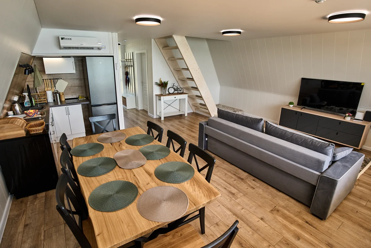 На территории базы представлены дома разной вместимости — от компактных коттеджей для двоих до просторных домов, рассчитанных на большие компании.