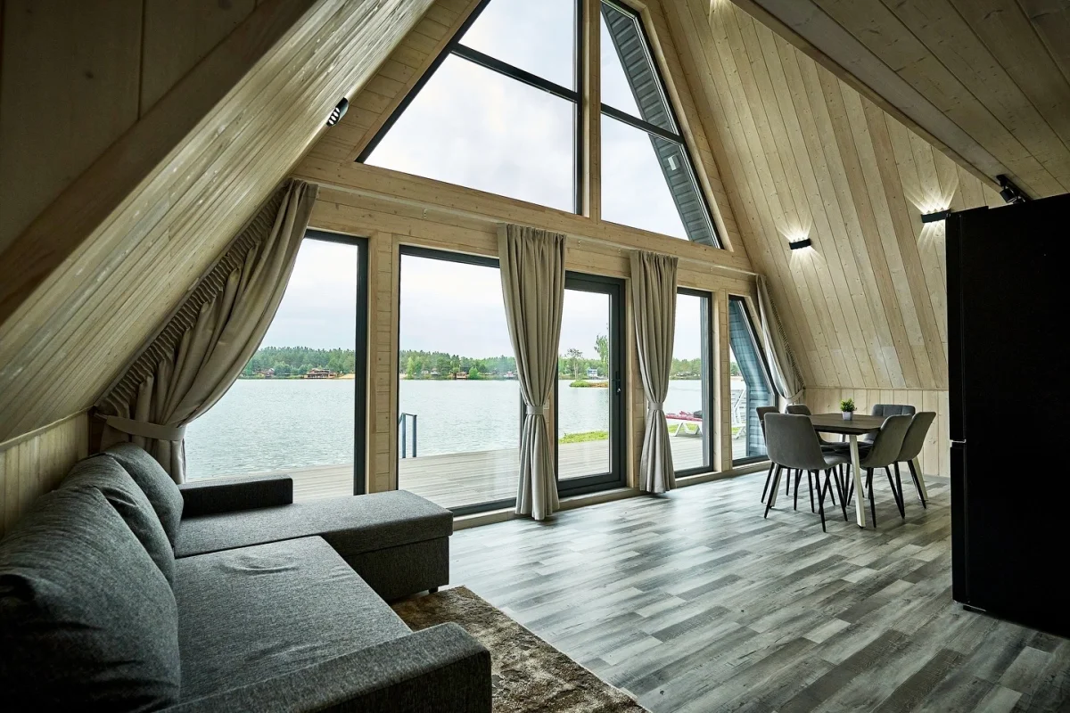 Особое внимание привлекают дома в стиле «А-фрейм» — треугольной формы здания, где двускатная крыша опускается до самого фундамента и выполняет роль стен. Стиль отличается современным внешним видом, часто его выбирают как раз для создания уютных домов в живописной местности.