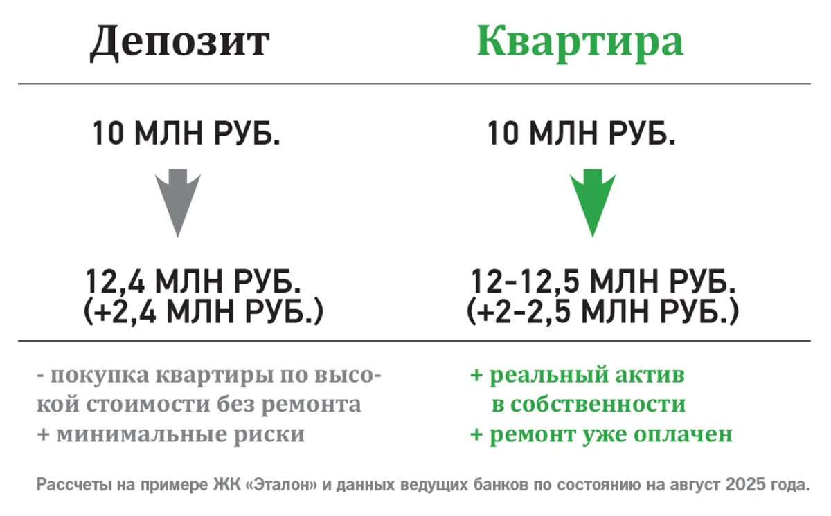 Супруга предлагает другой сценарий: вложить те же 10 млн в квартиру на этапе строительства. Здесь результат не столь предсказуем, но статистика показывает: за два года цена жилья может вырасти на 20–25%. Это те же 2–2,5 млн «сверху». Но в отличие от депозита, семья получает реальный актив: готовую квартиру, которая может приносить доход от аренды или стать новым жильем для детей.