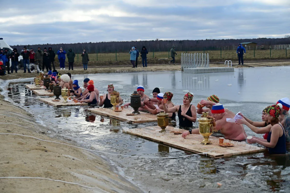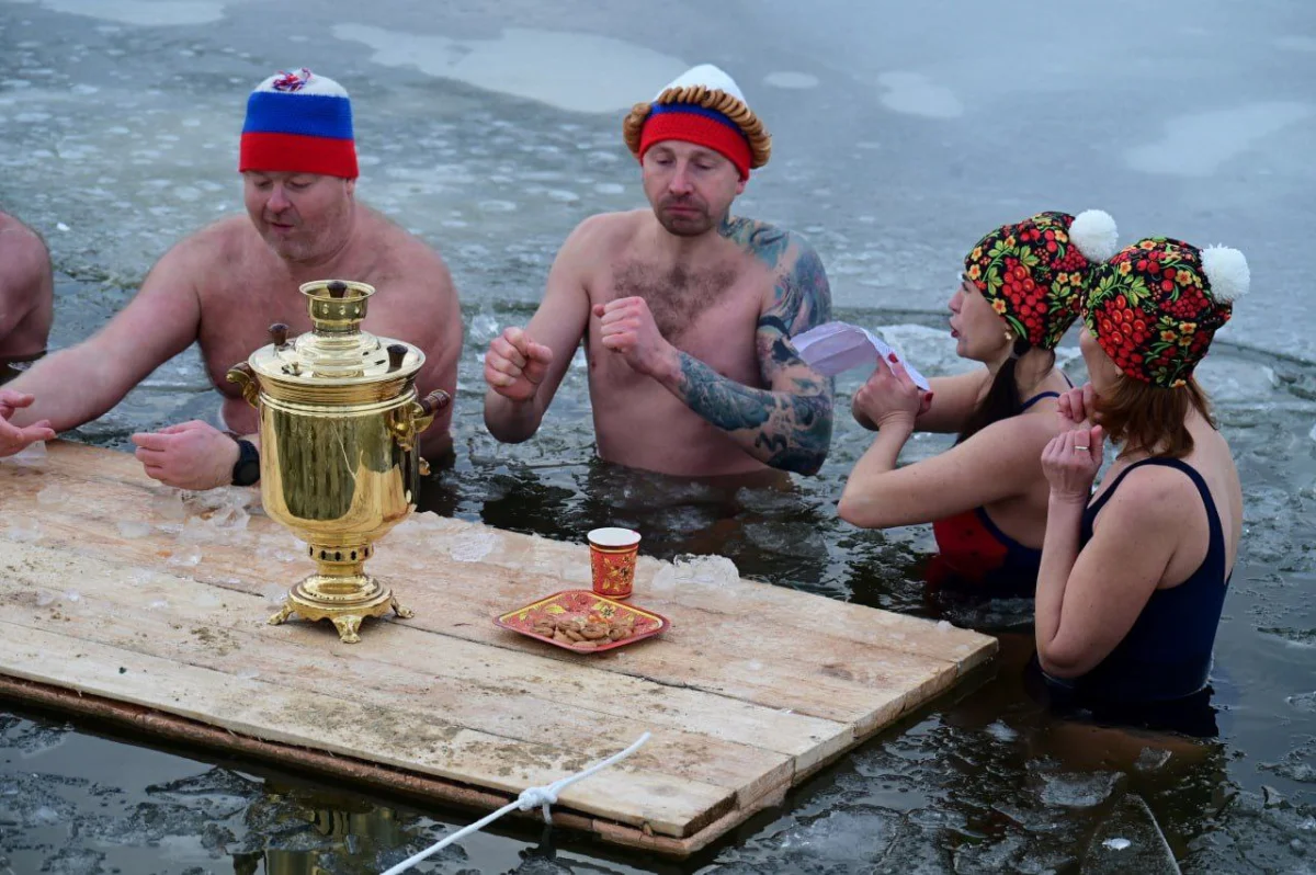 - Для установления рекорда 34 закалённых энтузиаста одновременно вошли в прорубь и провели в ледяной воде 15 минут, - рассказал глава района Вячеслав Парфенов. - Особенностью стал не сам факт купания, а его антураж: участники пили горячий чай с сушками, который подавали из 15 настоящих антикварных самоваров, специально растопленных на берегу.