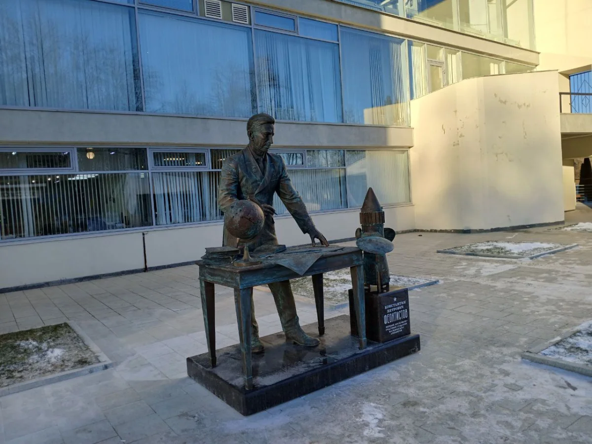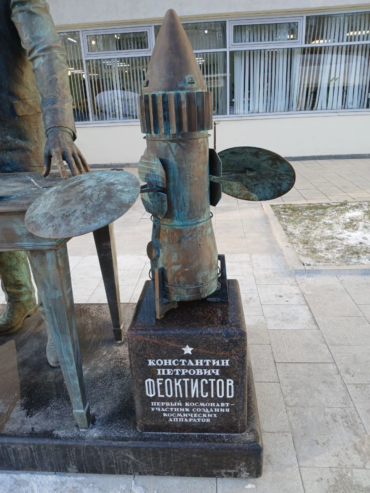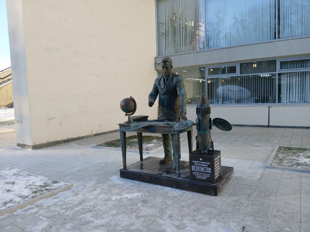 Бронзовую композицию изобразили так, будто Феоктистов находится за рабочим столом: рядом с ним - чертежи, приборы, глобус и макет ракеты.