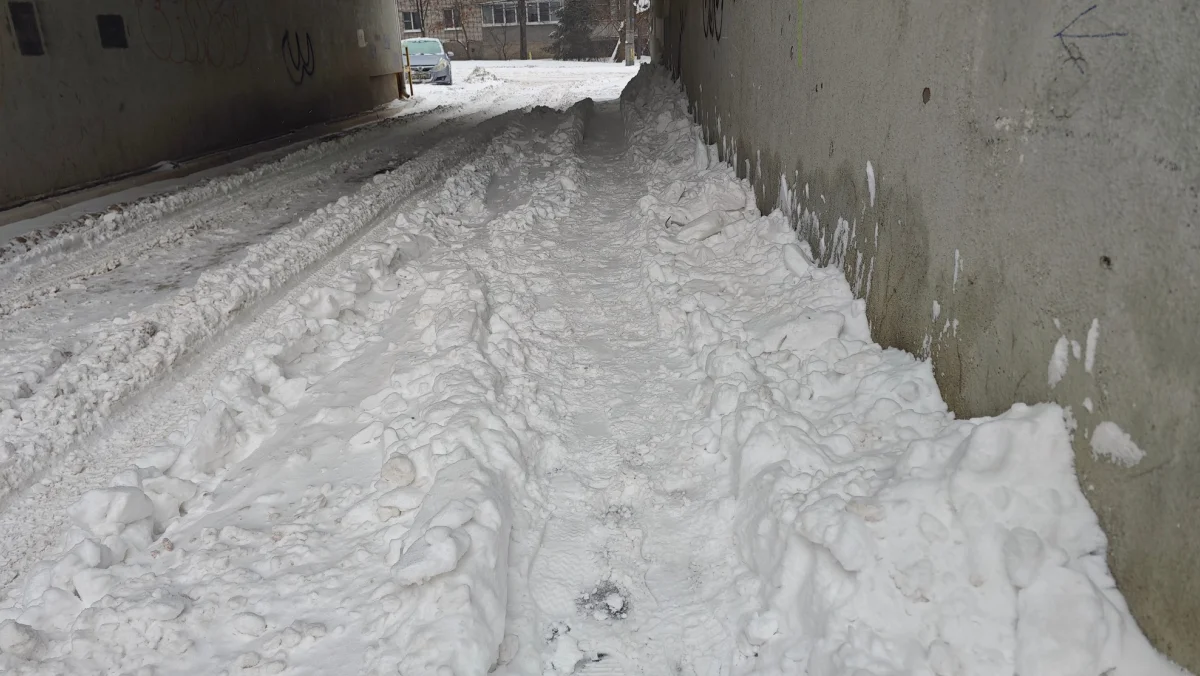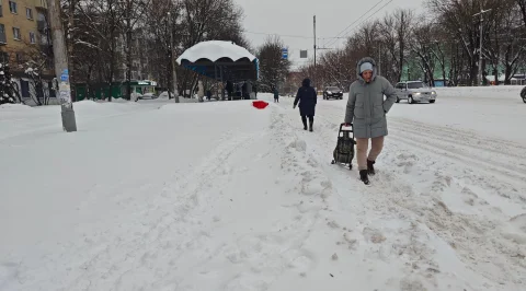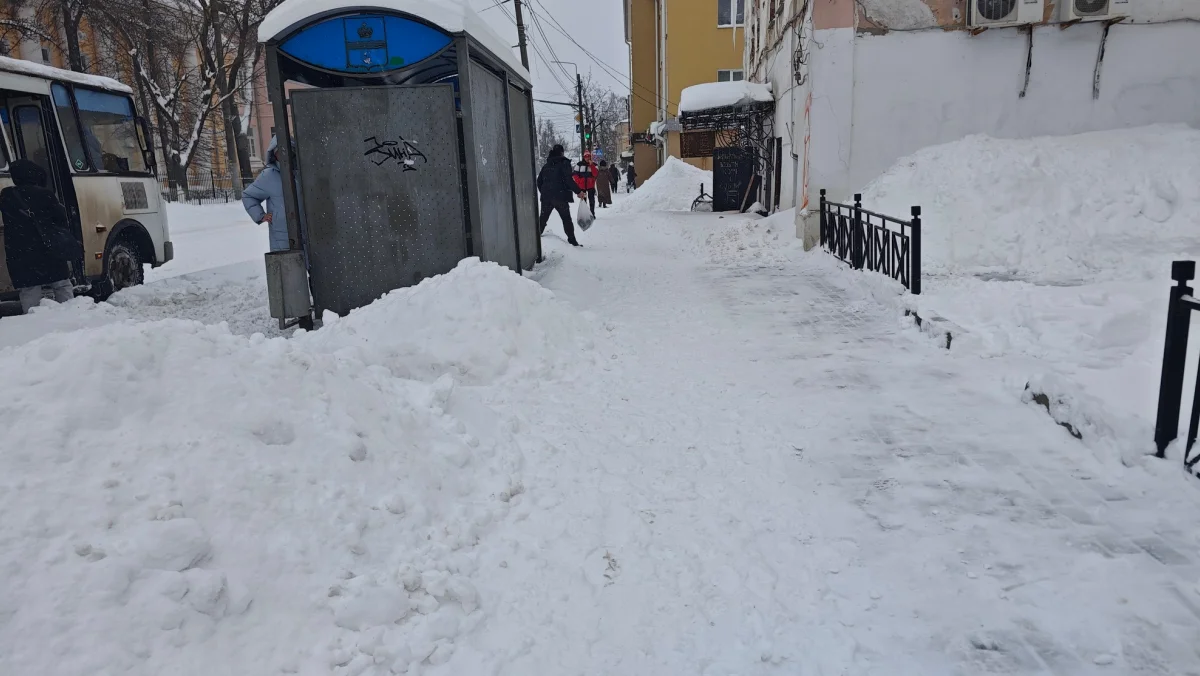 Тротуары по всему городу превратились в тропки. В центре мы увидели почищенные трактором только вдоль домов. Даже к остановкам и уж тем более в дворовые проезды ведут тропинки.