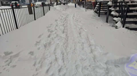 Здесь нечищенные участки тротуара чередовались с почищенными.