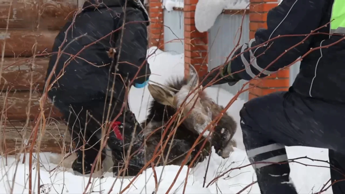Истощенного лосёнка удалось поймать, чтобы перевезти в центр реабилитации диких животных «Феникс» в Калуге.