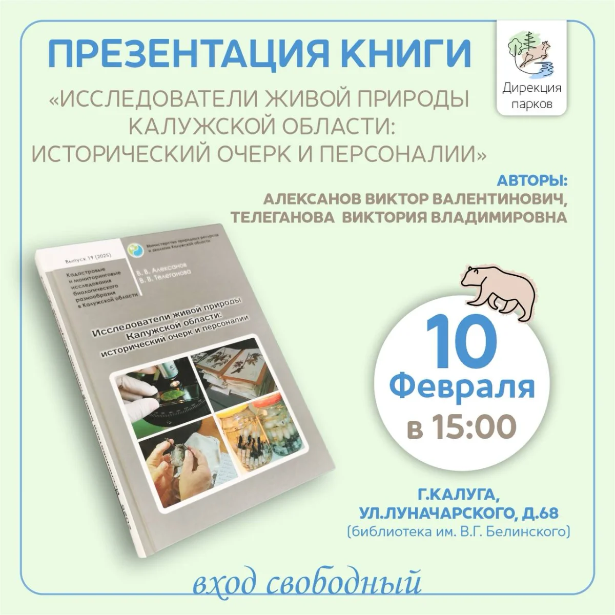10 февраля в 15:00 в Калужской областной научной библиотеке имени В.Г. Белинского пройдёт презентация новой книги «Исследователи живой природы Калужской области: исторический очерк и персоналии».