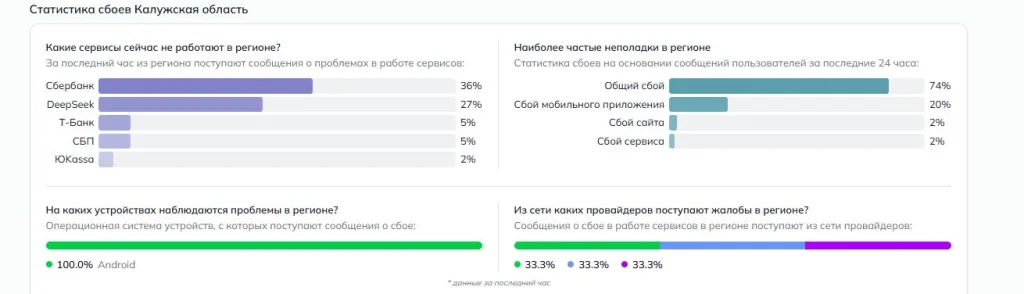 Согласно данным сервиса DownDetector,в нашем регионе имеются проблемы с доступом к Сбербанку, СБП и китайской нейросети DeepSeek. При этом в комментариях калужане пишут о сбоях даже в в работе сайтов из белых списков, на которые нельзя зайти с мобильного интернета.