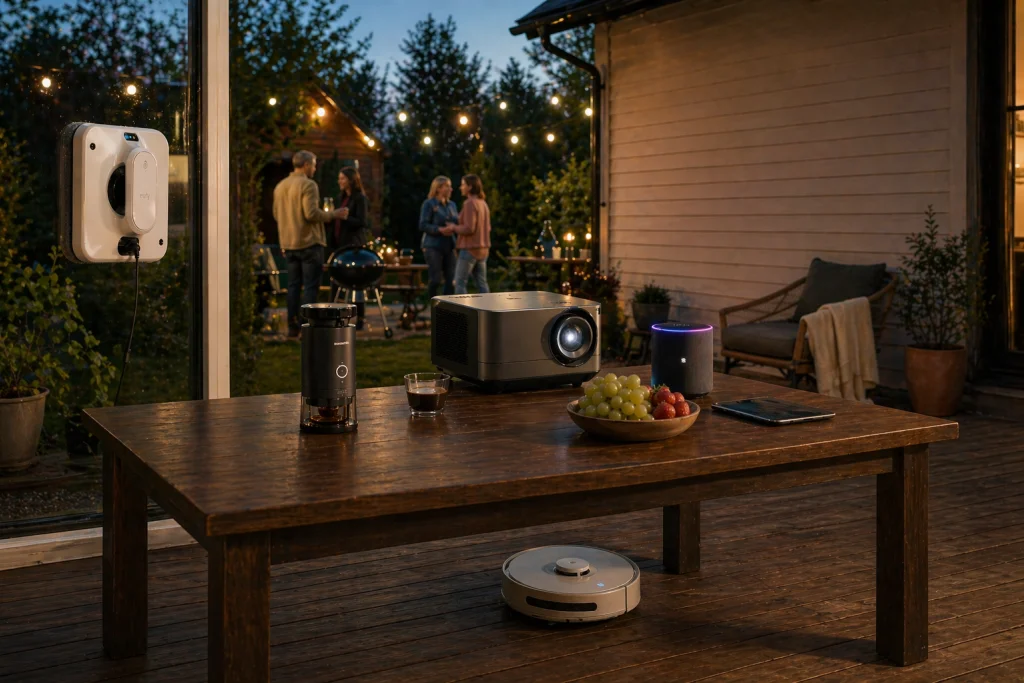 Начало сезона — это всегда уборка. Окна в доме, беседке, на веранде — обычно это часы мучений с тряпкой и стремянкой. Интеллектуальный робот делает все сам. Моет не только стекло, но и плитку, мрамор, зеркала. У него есть защита от падения, несколько режимов мойки, а управлять можно через приложение на телефоне или пульт. В итоге вы пьете кофе, а робот оттирает окна.