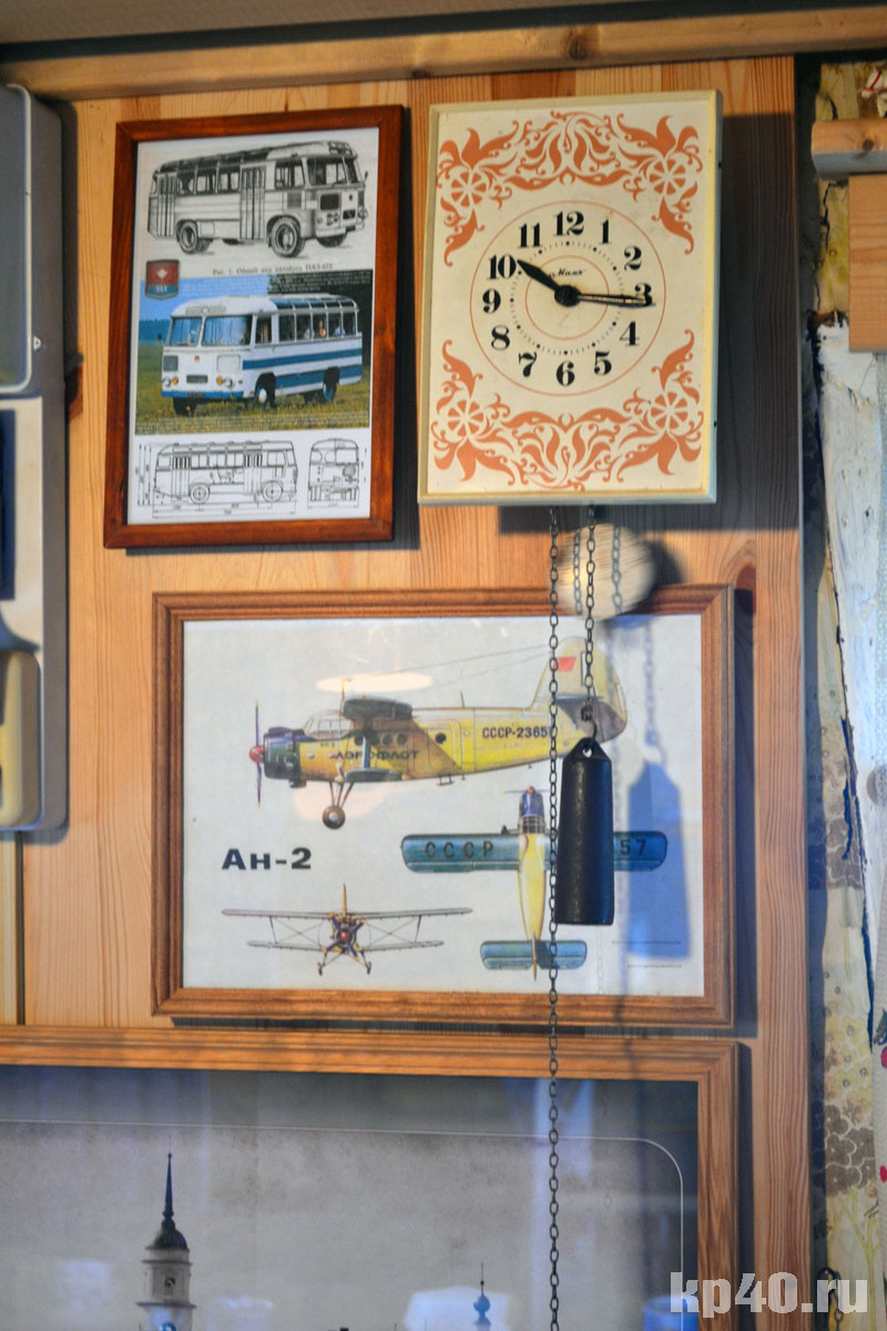 - Часы тоже старые, мне их кто-то отдал, они у меня долго валялись, - рассказывает Алексей. - Я с трудом уговорил часовщика, чтобы он их отремонтировал: «Нет деталей, негде взять, неохота ковыряться». Удивительная вещь, если у них гири опускаются до определенного уровня, часы останавливаются. Когда это происходит ночью, я просыпаюсь, слышу - часы остановились. Я думаю, что трудно найти дом, в котором на стене висит ПАЗик и самолет. Это ностальгия по детству: автобус нас довозил за 6 км до деревни, а самолет летал в районе Подкопаево. И мы даже один раз на нем летали.
