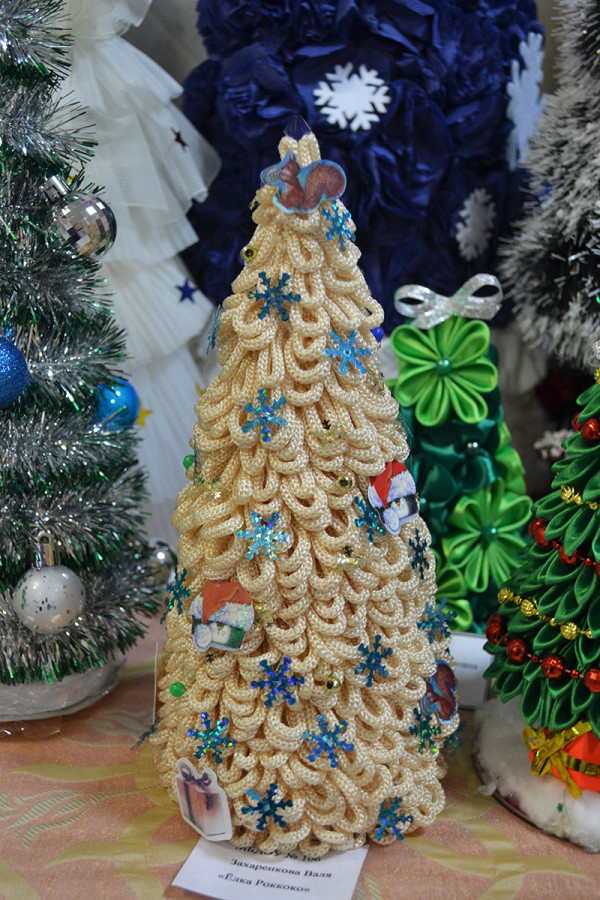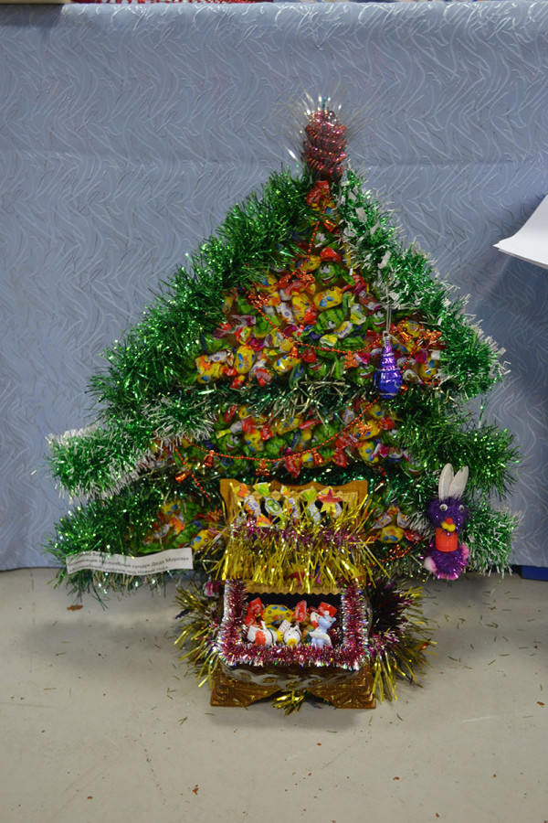 Какой же Новый год без ёлочки. Её смастерили из ниток, бумаги, шишек и даже конфет.