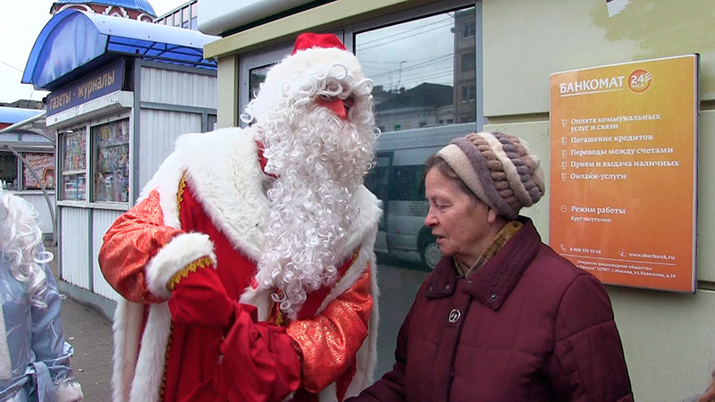 Из мешка калужанам раздаются сладкие подарки, Дед Мороз с помощниками поднимают настроение как маленьким детям, так и большим.