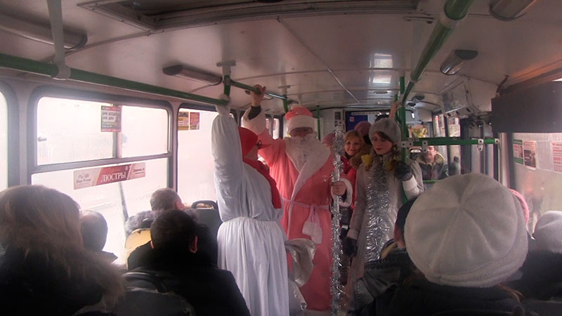 Мудрость и конфеты калужанам дарили Деды Морозы в троллейбусах
