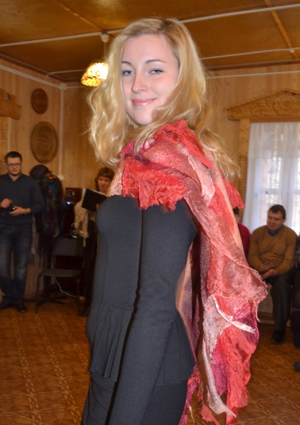 - Лет пять назад в Москве я увидела валеные игрушки и буквально влюбилась, - рассказала одна из организаторов, мастерица Нина ДВОРЕЦКАЯ. - Захотелось самой попробовать. А потом уже остановиться не смогла. Сначала занималась войлоком, как любитель, а потом организовала творческую мастерскую. И мало кто догадывается, что раньше я работала деканом гуманитарного факультета одного из калужских вузов... Интерес не пропадает, мне хочется делать новые и новые вещи - в основном тапочки, варежки, шарфы. А как-то раз заказали свалять мужские валенки 45-го размера, но это уже не женское дело, отказалась.