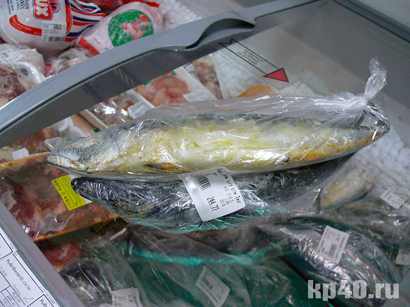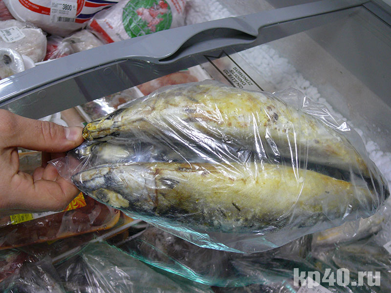 Судя по ценнику, скумбрия упакована 27 января этого года. Внешний же вид – желтое брюхо, куски отвалившейся чешуи - говорит о том, что рыба пролежала в холодильнике не один месяц.