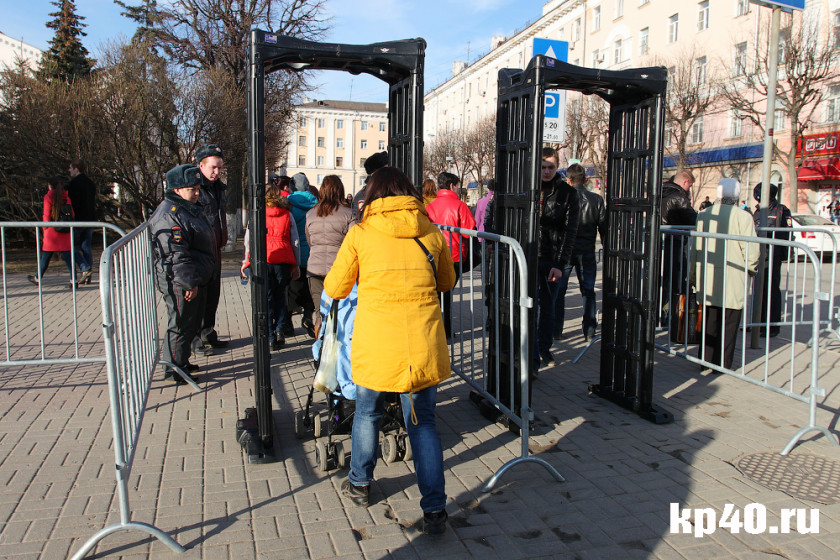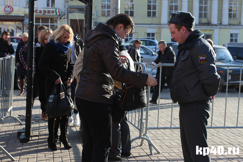 Примерно за час до начала праздничного концерта её огородили металлическими заборчиками. На саму площадь можно было попасть, только пройдя через специальные рамки. Некоторых калужан полицейские деликатно просили показать содержимое сумочек. К слову, в прошлом году всё было более демократично и открыто: никаких рамок и заборов.