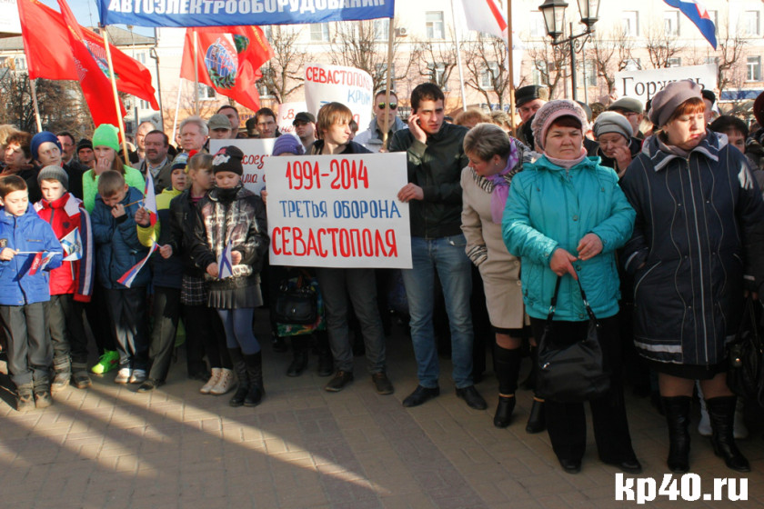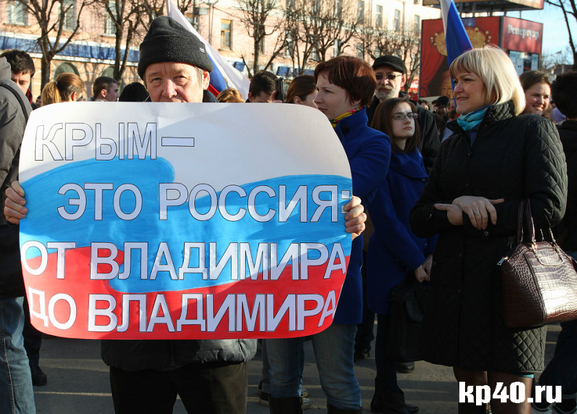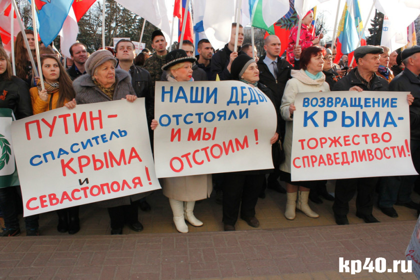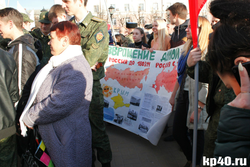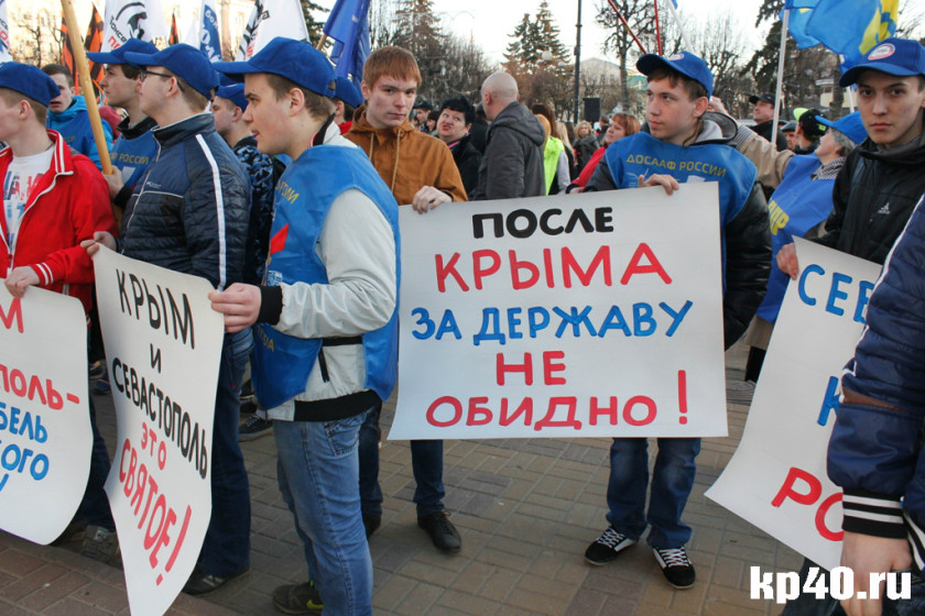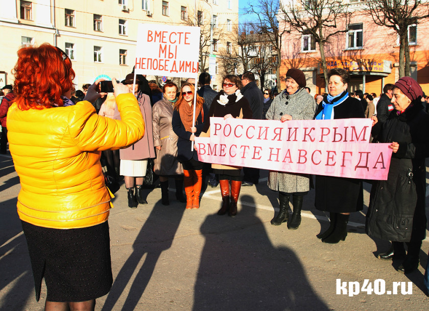 Пока шёл концерт, я разглядывала плакаты, с которыми пришли на митинг-концерт калужане. Почти все были нарисованы от руки. Содержание примерно следующее: «Россия и Крым – вместе навсегда!», «Воссоединение Крыма с Россией – воля народа!», «После Крыма за державу не обидно!», «Крым и Севастополь – колыбель русского духа!», «Счастливы вместе!» Некоторые лозунги повторялись, что наводило на мысль о том, что сочинялись они централизованно.