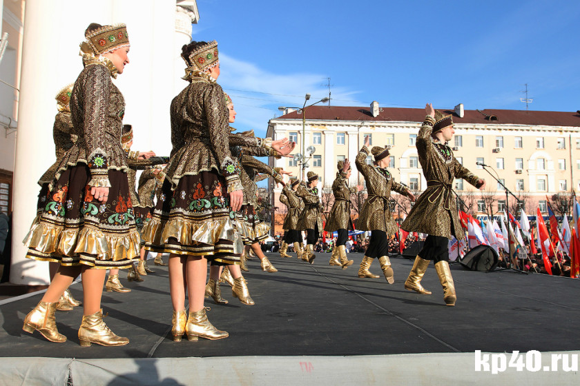 Торжественные речи выступающих сменялись танцевальными и вокальными номерами в исполнении калужских артистов и творческих коллективов. Вспомнилось, что в прошлом году на точно таком же концерте выступала группа «Уч-Кудук». В этом решили обойтись своими силами.