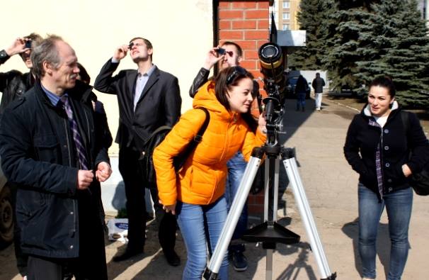 Студенты КГУ им. К.Э. Циолковского, а также посетители дома-музея им. А.Л. Чижевского могли наблюдать затмение с помощью телескопа.
