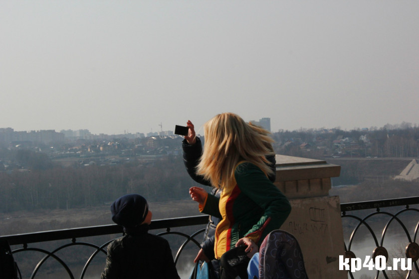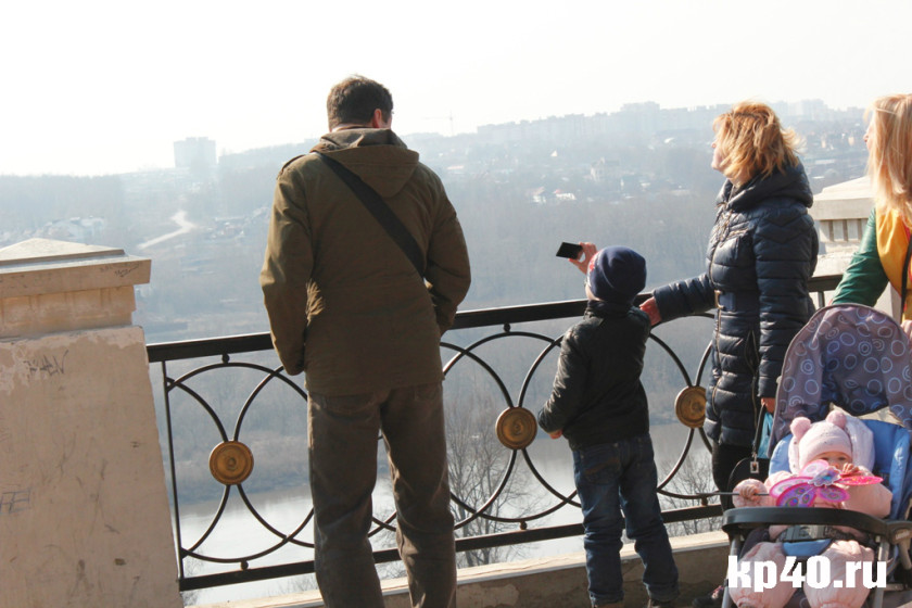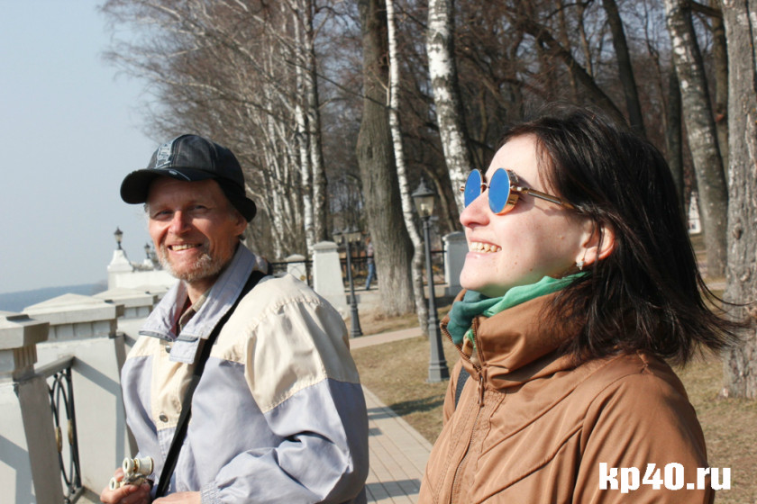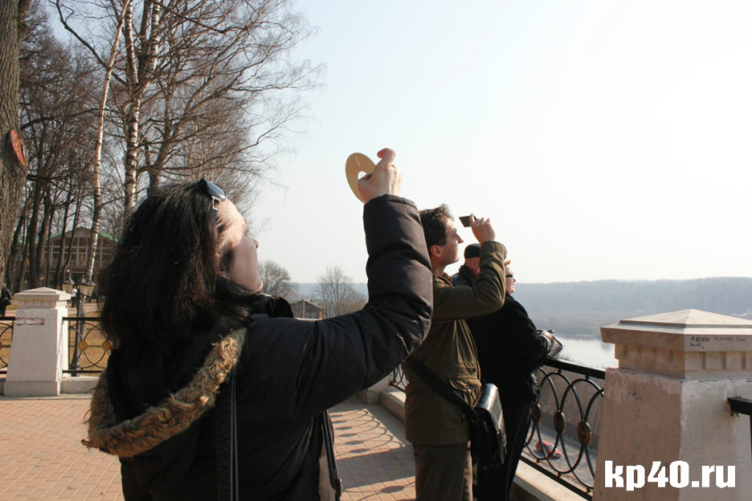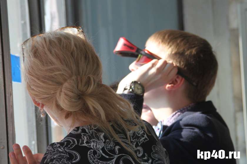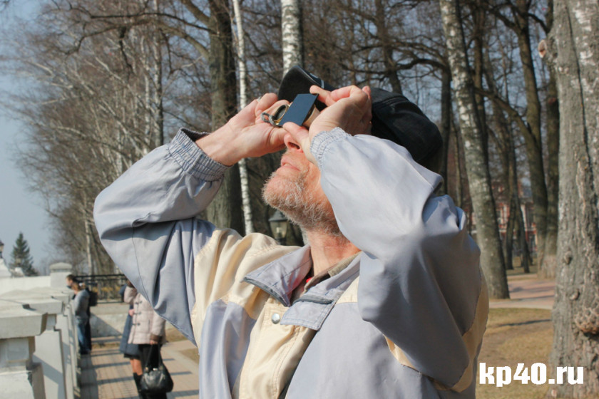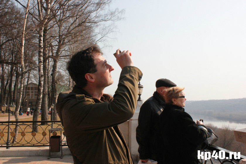 Небольшую концентрацию заинтересованных калужан мы обнаружили на смотровой площадке. Несколько человек передавали друг другу тёмный прямоугольничек, направляли его на солнце, произносили: «Ух ты, как красиво!» - и передавали прямоугольник следующему.