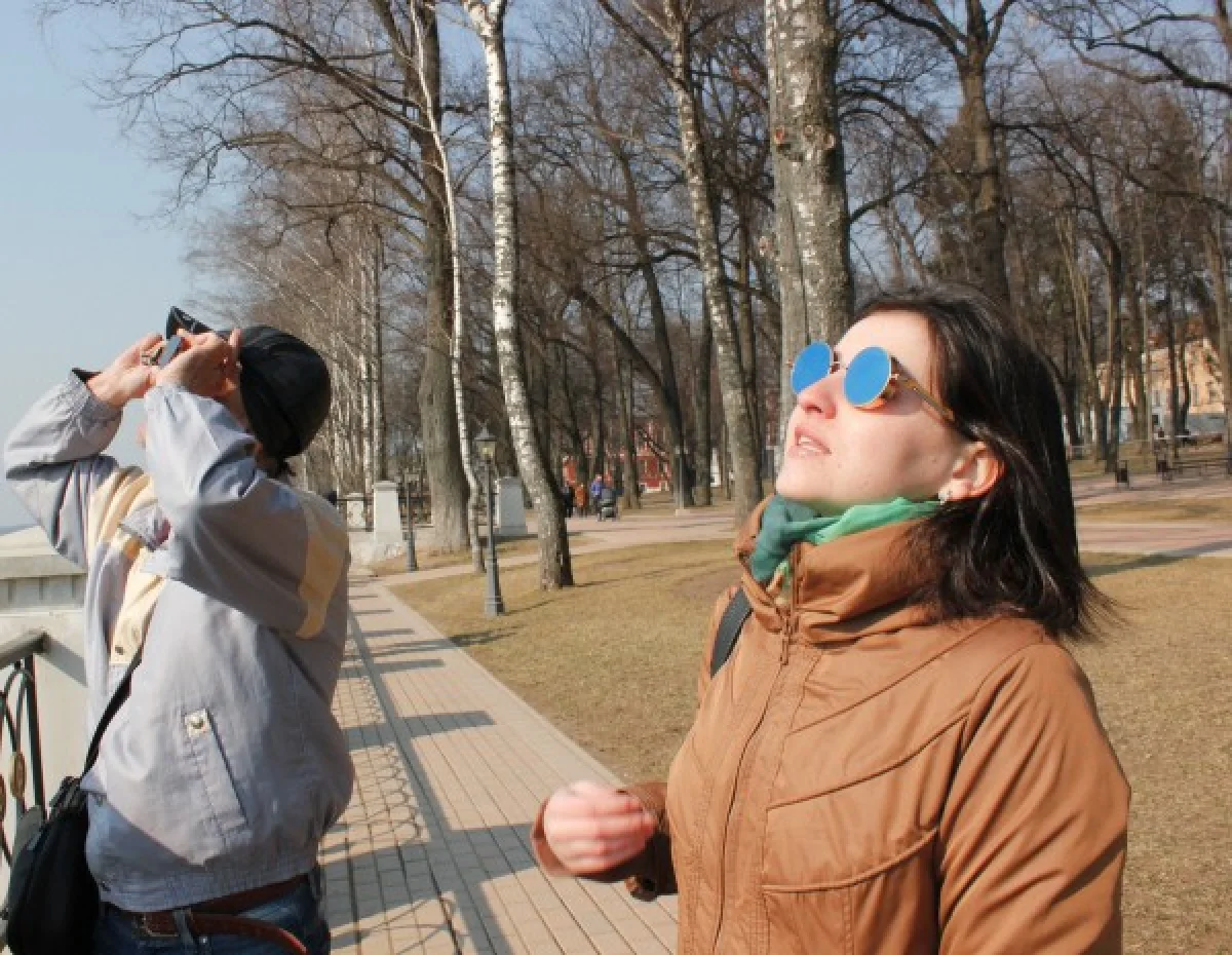Наблюдать солнечное затмение мы с друзьями отправились в городской парк культуры и отдыха. Признаться, и по дороге туда, и в самом парке я ожидала увидеть десятки калужан, устремивших взоры в небесную высь. Но, увы, таковых я насчитала единицы.