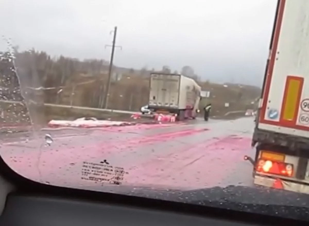 После аварии под Мещовском дорога окрасилась в розовый цвет. Фуру с краской буквально вспороли.