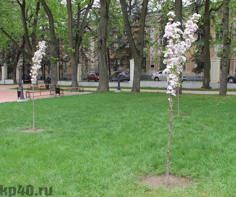 Заслуживает отдельного внимания зелёное строительство парка. Оно происходило постепенно. Сначала был так называемый Городской сад, отдельно от него сад при доме губернатора, а у Троицкого собора Владимирская аллея. Липовая аллея, идущая вдоль западного корпуса Присутственных мест, была посажена в 1905 году. Среди 80-100-летних клёнов, лиственниц, выделяется 500-летний дуб. Некоторые краеведы считают, что он гораздо старше, называя дуб ровесником Калуги. Недавно его признали национальным достоянием и внесли в Национальный реестр старовозрастных деревьев. В послевоенные годы в парке высажены конский каштан, ясень, акация белая, яблоня-китайка, рябина, и кустарники: сирень, гордовина, жимолость, акация желтая. А несколько лет назад появилась аллея сакуры.
