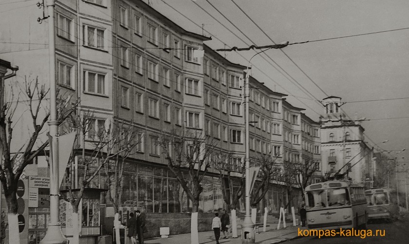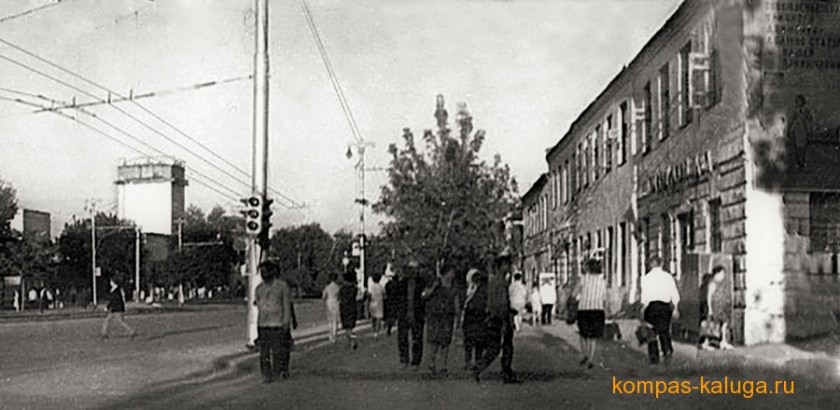 Улицу Кирова пересекает улица Театральная. Здесь стоит ТЦ «Калуга». А когда-то на этом месте был небольшой домик, но его снесли для постройки универмага.