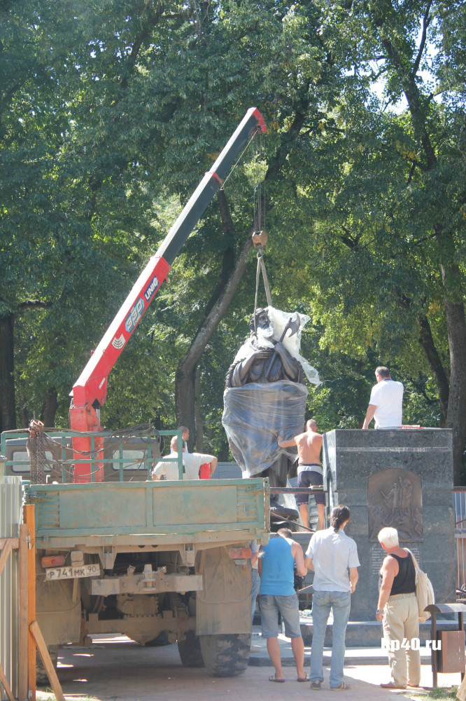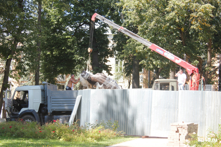 Около 12:00 под взгляды любопытных зевак машина привезла памятник. Помогал его устанавливать бывший главный архитектор города Евгений ГОЛЫШЕВ.