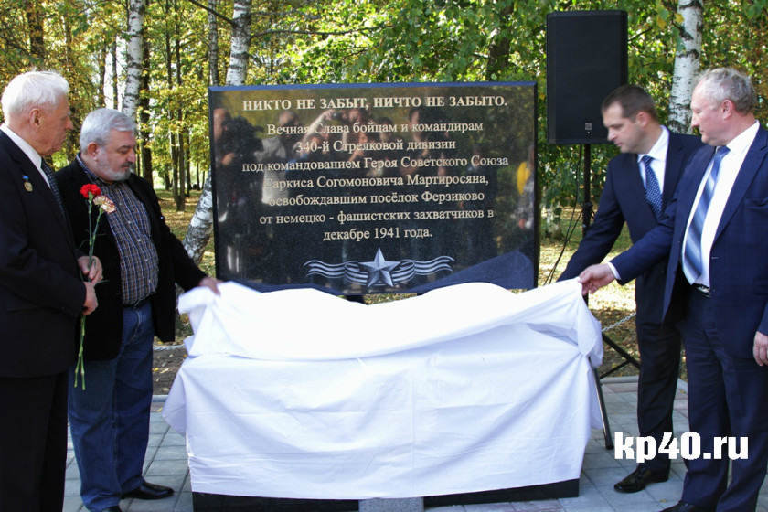 В понедельник, 21 сентября, в Ферзиково открыли памятник 340-й стрелковой дивизии, бойцы которой под командованием Героя Советского Союза Саркиса Мартиросяна в конце декабря 1941 года освободили этот районный центр от немецко-фашистских захватчиков.