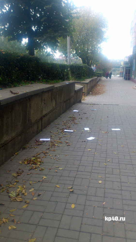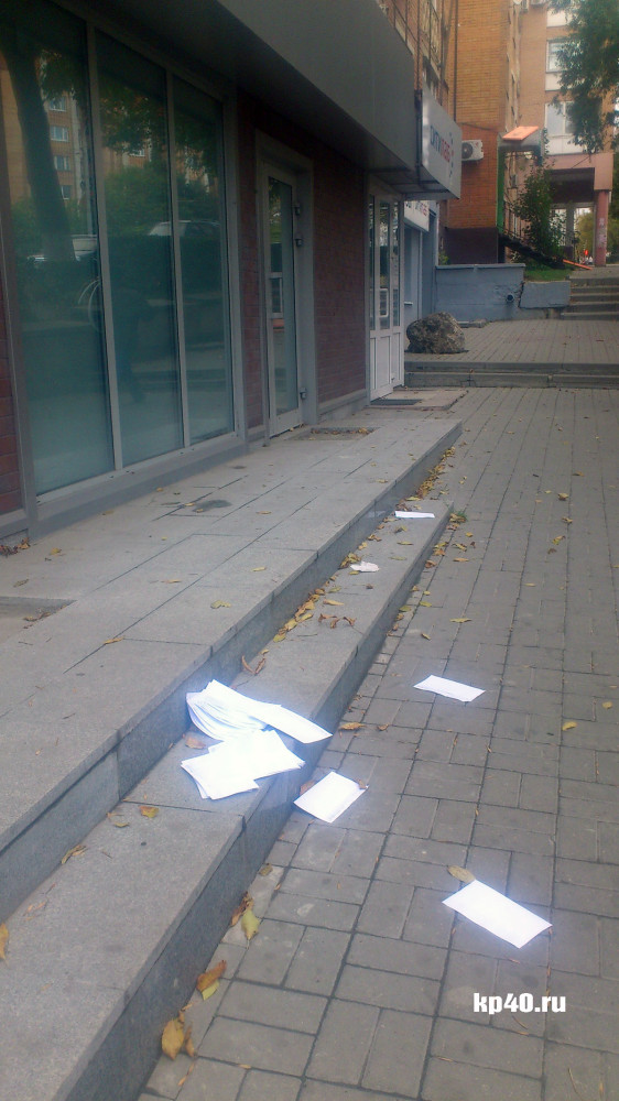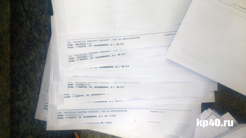 В субботу, 10 октября, около 3 часов дня на улице Гагарина в Калуге на тротуаре валялись счета за электроэнергию. Фотографии в редакции прислал наш читатель. На всех квитанциях фигурировал один адрес - общежитие на улице Большевиков, 1. Судя по фотографиям, счета были не распечатаны.