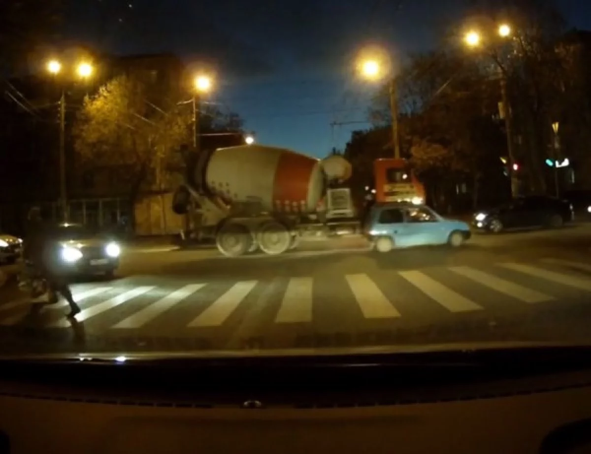 На втором месте - запись аварии на перекрестке улиц Маршала Жукова и Максима Горького. «Ока» и бетономешалка не поделили дорогу.