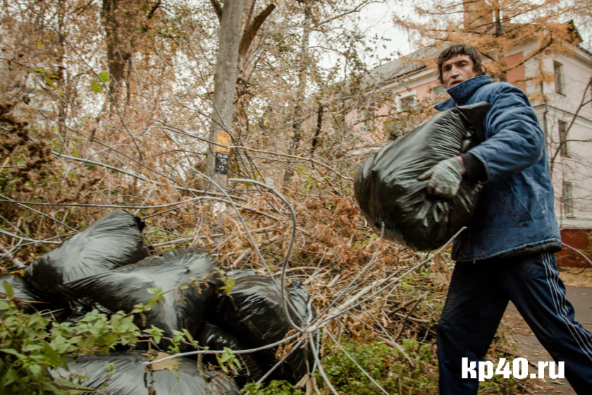 Рядом со свалкой интенсивно собирают листву. Разгоряченные трудом рабочие скидывают шапки и куртки.