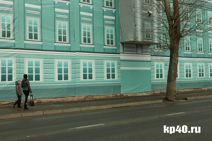 Сгоревшее здание уже несколько лет стоит в полуразрушенном состоянии, зато прикрыто ярким полотном. Издалека взглянешь – Зимний дворец.