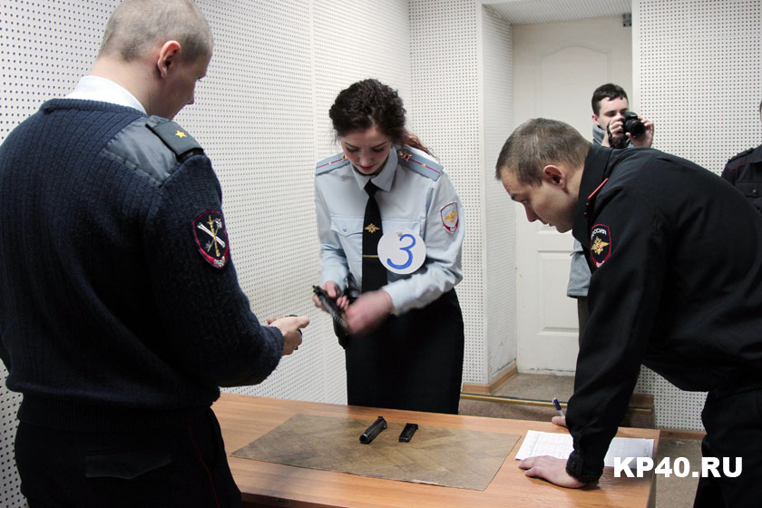 Первой выходит конкурсантка под номером 10 – Анжелика Косовичева. Ловко извлекает из пистолета магазин, проверяет оружие на заряженность, отделяет затвор от рамки, снимает пружину, кладёт её и пистолет на стол.