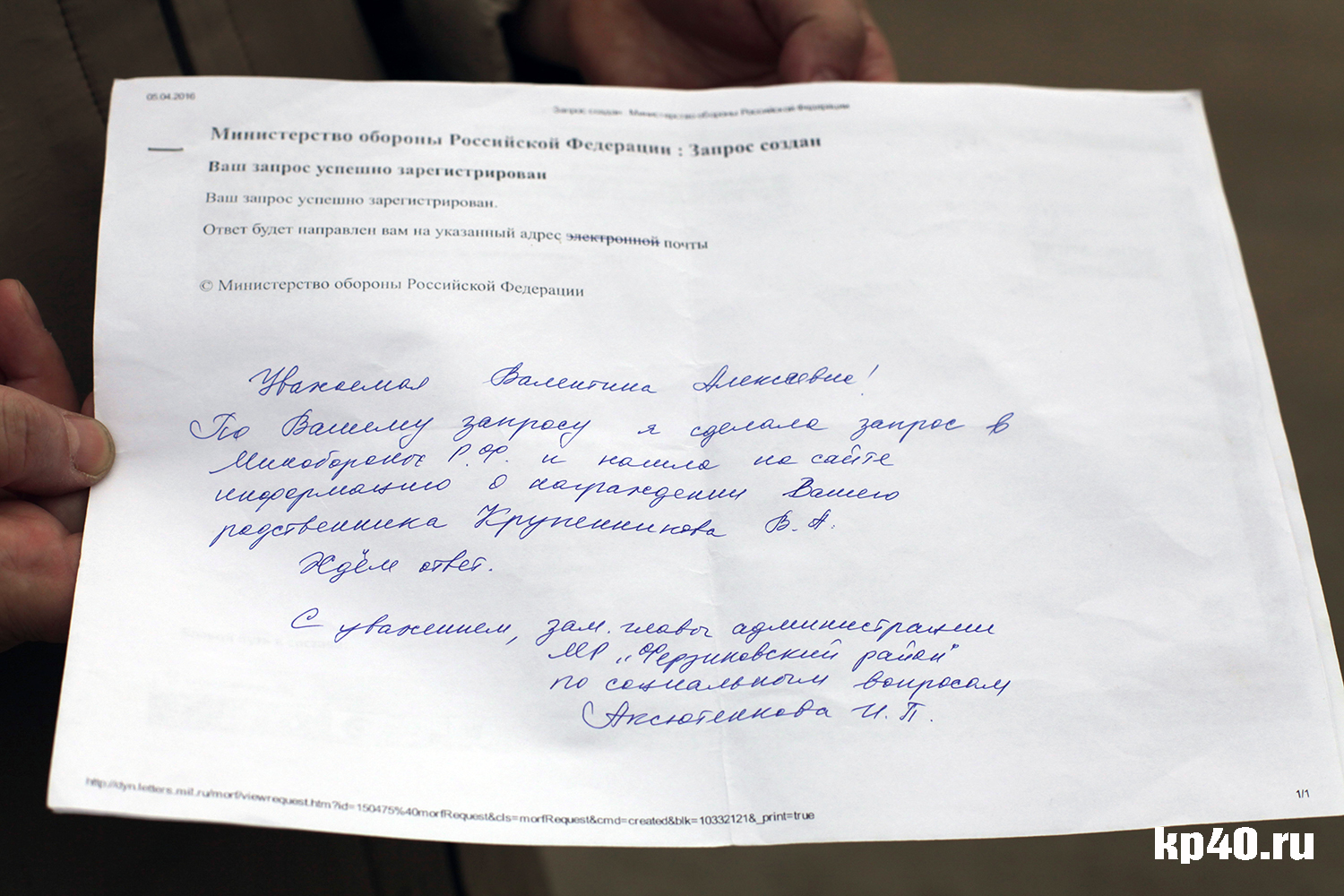Во второй раз внучатая племянница погибшего бойца обратилась в местную администрацию в начале апреля. Заместитель руководителя тут же отправила запрос в Министерство обороны РФ. Однако ответа на него до сих пор нет.