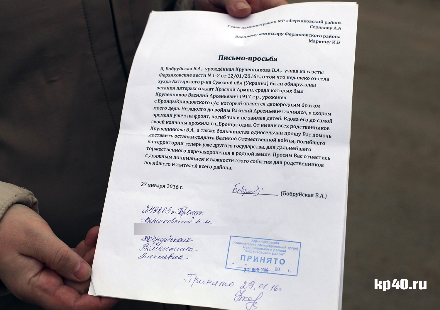 - Я нашла эту женщину, - говорит Людмила Юрьевна. – Мы вместе с местными поисковиками помогли ей написать письмо с просьбой помочь доставить в Калужскую область останки её родственника. Отнесли письмо в районную администрацию, где оно и пролежало два месяца, никому не нужное.