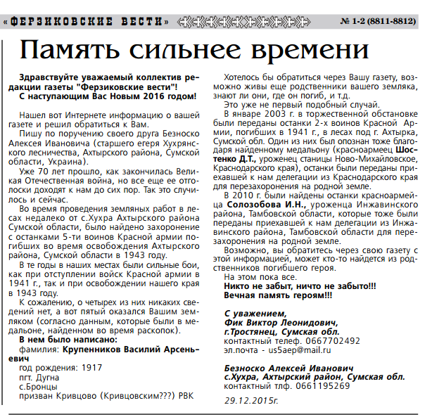 Эта история началась в первых числах января 2016 года. Именно тогда в районной газете «Ферзиковские вести» было опубликовано письмо жителя украинского города Тростянец Сумской области Виктора ФИКА. Он сообщал о найденных неподалёку от села Хухра останков нашего земляка, жителя села Бронницы Ферзиковского района Василия Арсеньевича Крупенникова, погибшего на этой земле в годы Великой Отечественной войны.