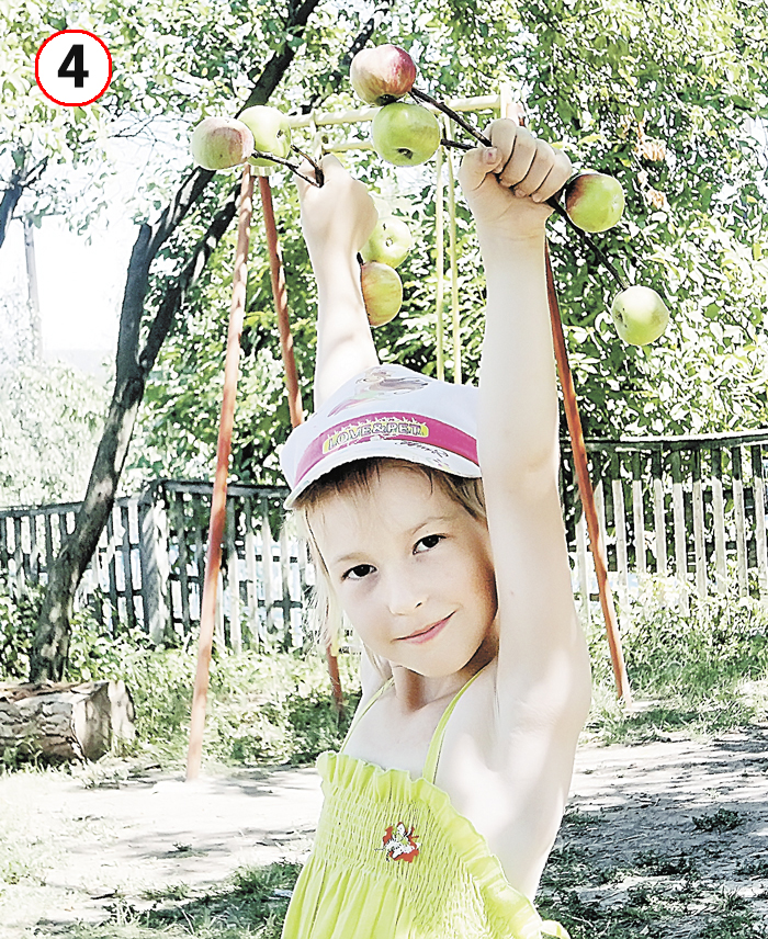 — Раз-два, раз-два, делаем зарядку! Гантели из яблок — это источник не только витаминов, но и здоровья и силы! На фото моя младшая дочь занимается «фруктовым» спортом.