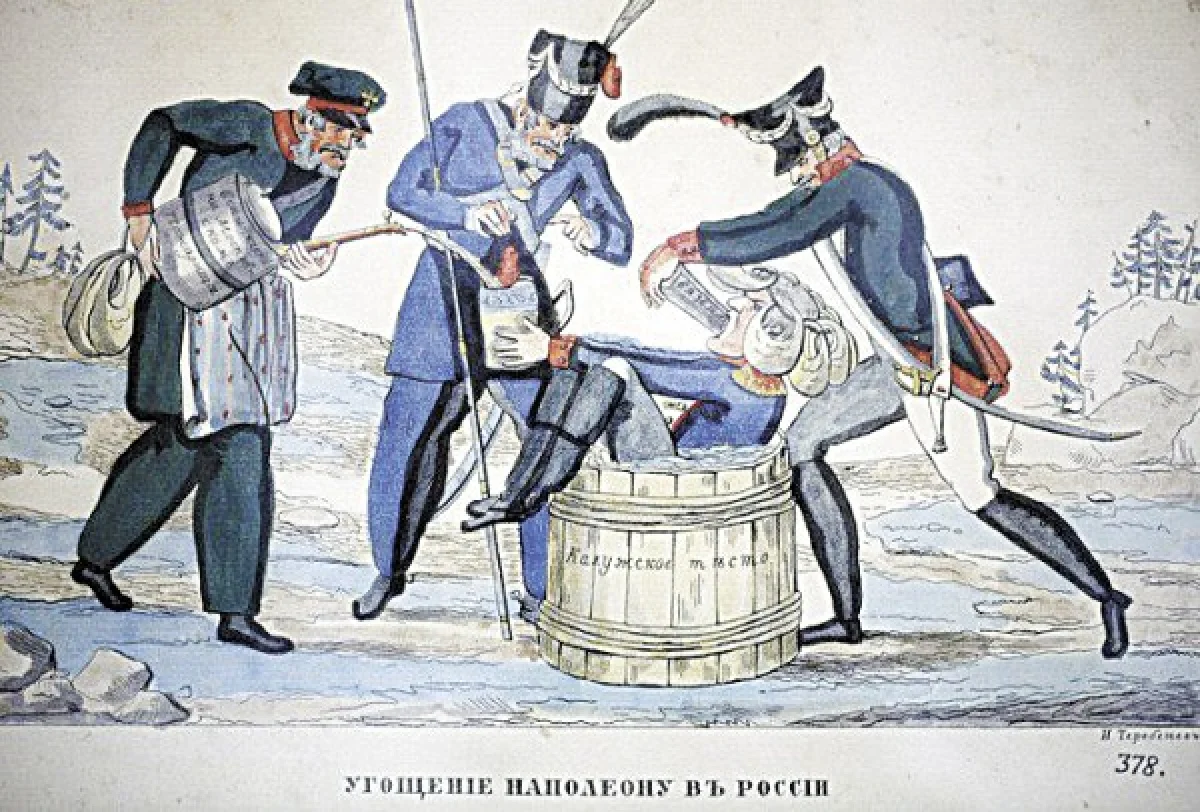 На ней изображен Наполеон провалившимся в кадку, на которой написано: «Калужское тесто». Солдат-гвардеец засовывает ему в рот коврижку с надписью: «Вязьма», ратник ополчения наливает горячий сбитень «вскипелось в московском пожарище», а казак кладет в сбитень перец.