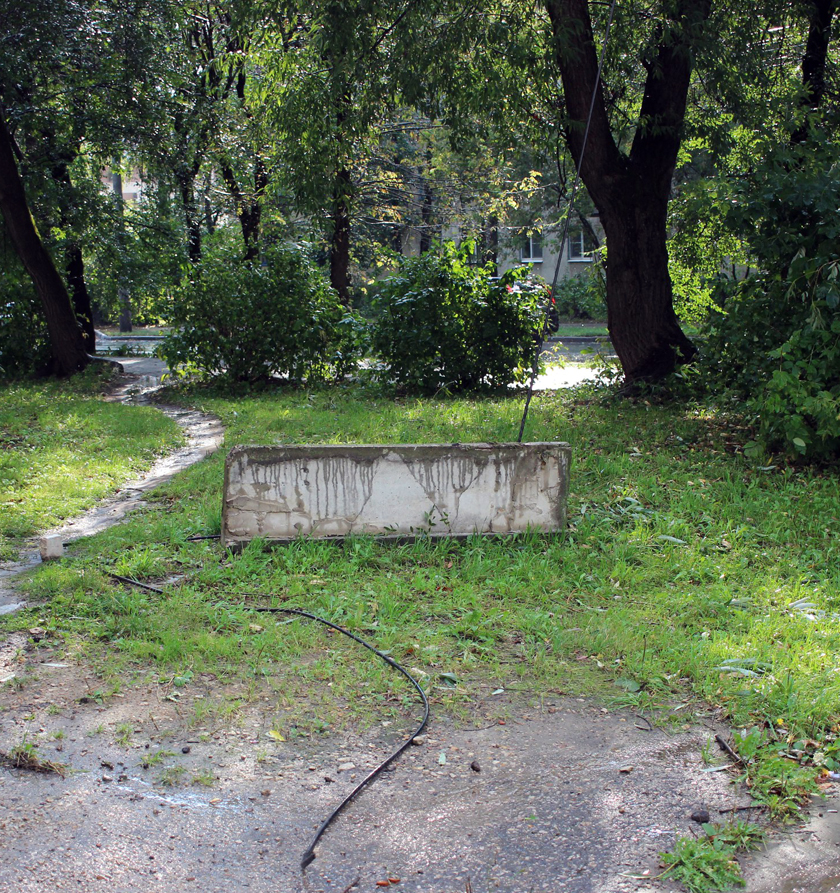Бетонную плиту сдуло с крыши дома по улице Рылеева, и падая она порвала провода и поломала ветки.
