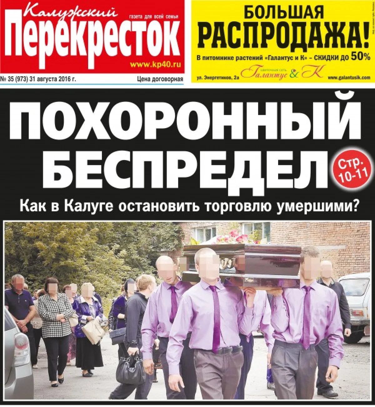 В среду, 31 августа, вышел в свет свежий номер газеты «Калужский перекрёсток». Одна из главных тем номера – «Похоронный беспредел в Калуге». В этом материале журналисты ищут ответы на следующие вопросы: кто и как наживается на горе людей? Сколько стоит плата за слив информации об умершем? Как находят для себя информаторов «чёрные» агенты? Можно ли победить коррупцию в похоронной сфере?