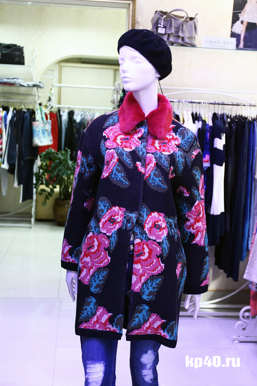 Лично мой взгляд пал на пальто Twin-Set, с ярким цветочным принтом, украшенное аккуратным красным меховым воротничком. Внимание привлек и кардиган той же марки с кожаным цветком – брошью на груди, очень стильное решение к джинсам-дудочкам и нежному, бельевому топу!