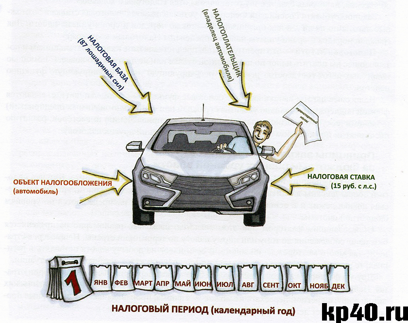 На этой иллюстрации школьникам объясняют, что такое объект налогообложения, налоговая база, налогоплательщик, налоговая ставка и налоговый период.