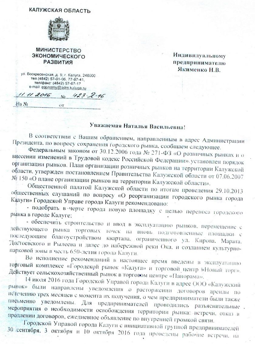 В понедельник, 14 ноября, в соцсетях появились сообщения о том, что городские власти Калуги продлили договор аренды с вещевым рынком до 31 марта 2017 года. В подтверждении этого предприниматели предоставили kp40.ru документ, подписанный министром экономического развития Калужской области Дмитрием РАЗУМОВСКИМ.