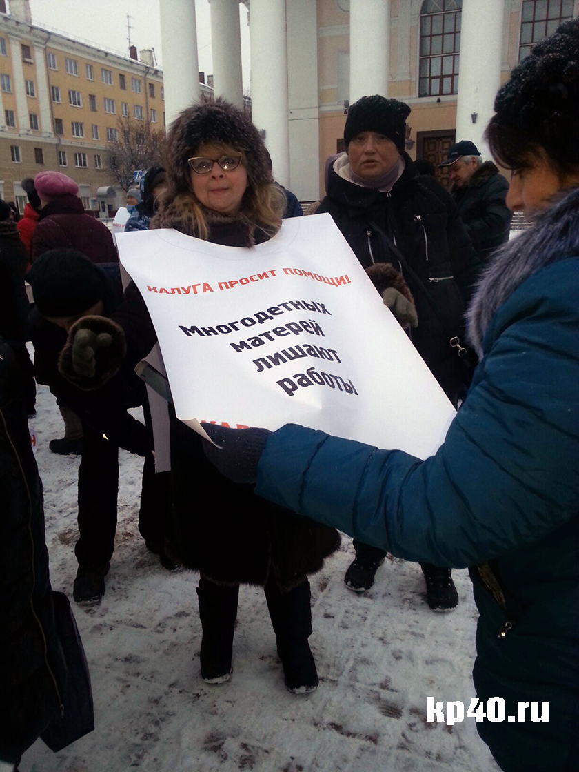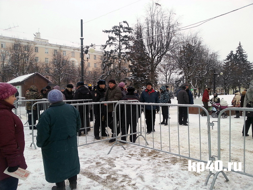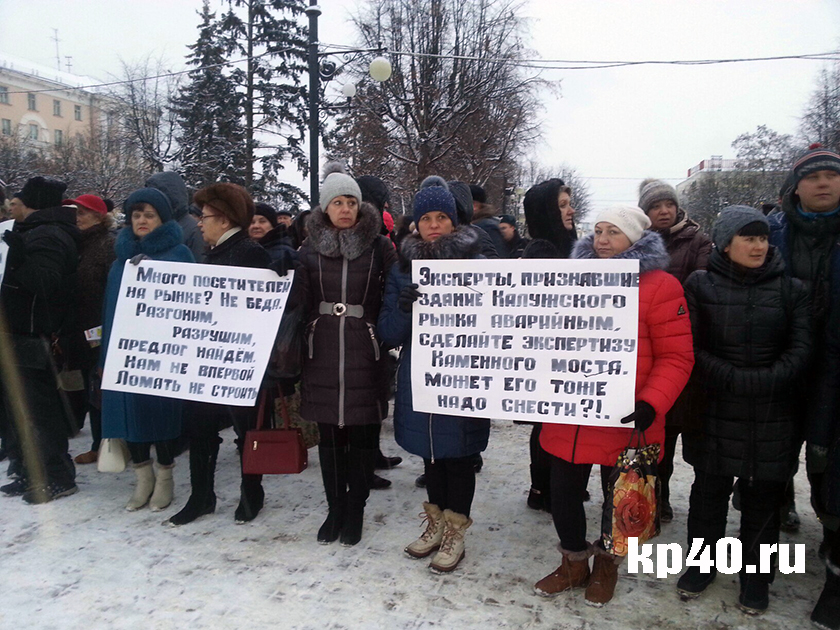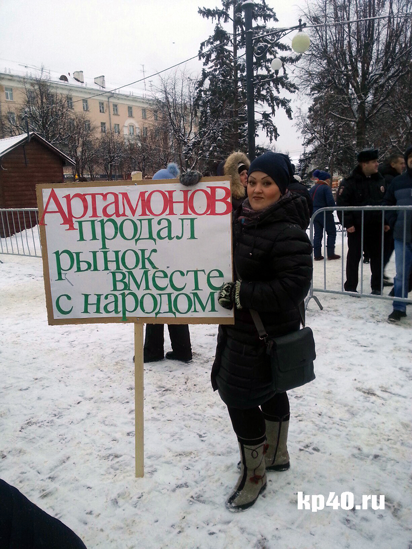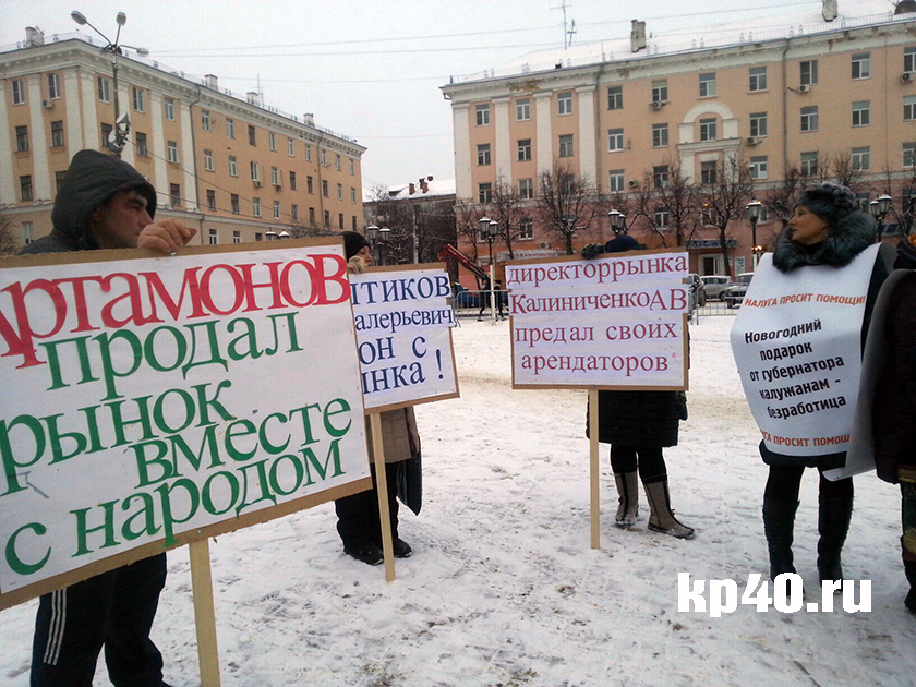 По состоянию на 16:30 на площади собралось около 300 участников протестной акции. Многие держат в руках плакаты: «Артамонов продал рынок вместе с народом», «Новогодний подарок калужанам от губернатора - безработица», «Многодетных матерей лишают работы» и др.