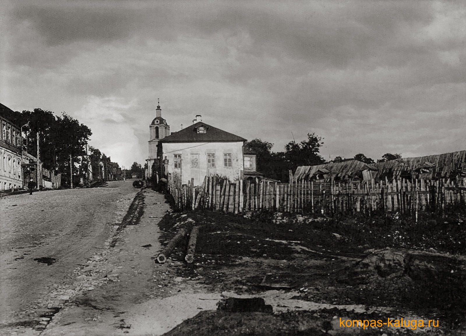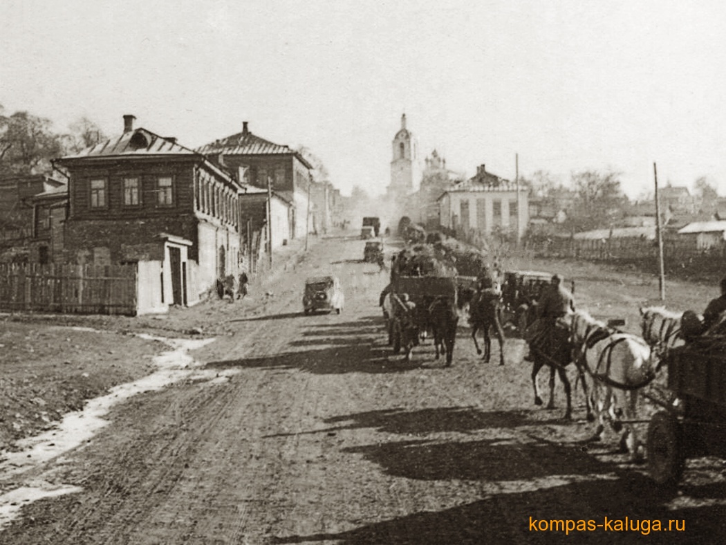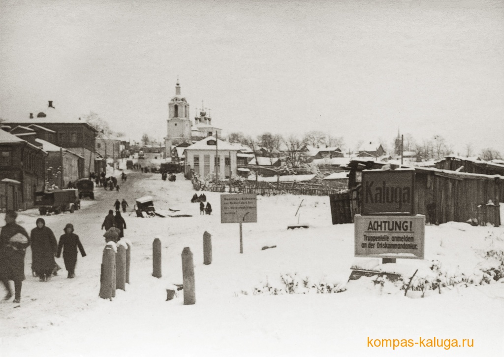 Декабрь 1941 года. На улице много людей — город живет своей жизнью. Видна церковь, а вдалеке - колокольня Троицкого собора. Фотография сделана в первые дни оккупации.