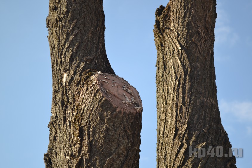 Молоденькие липы стали уродцами из-за обрезки. Напротив них стоят старшие братья – 30-летние деревья, стволы которых срезаны наполовину. Места среза замазаны, но через них проступает грибок.