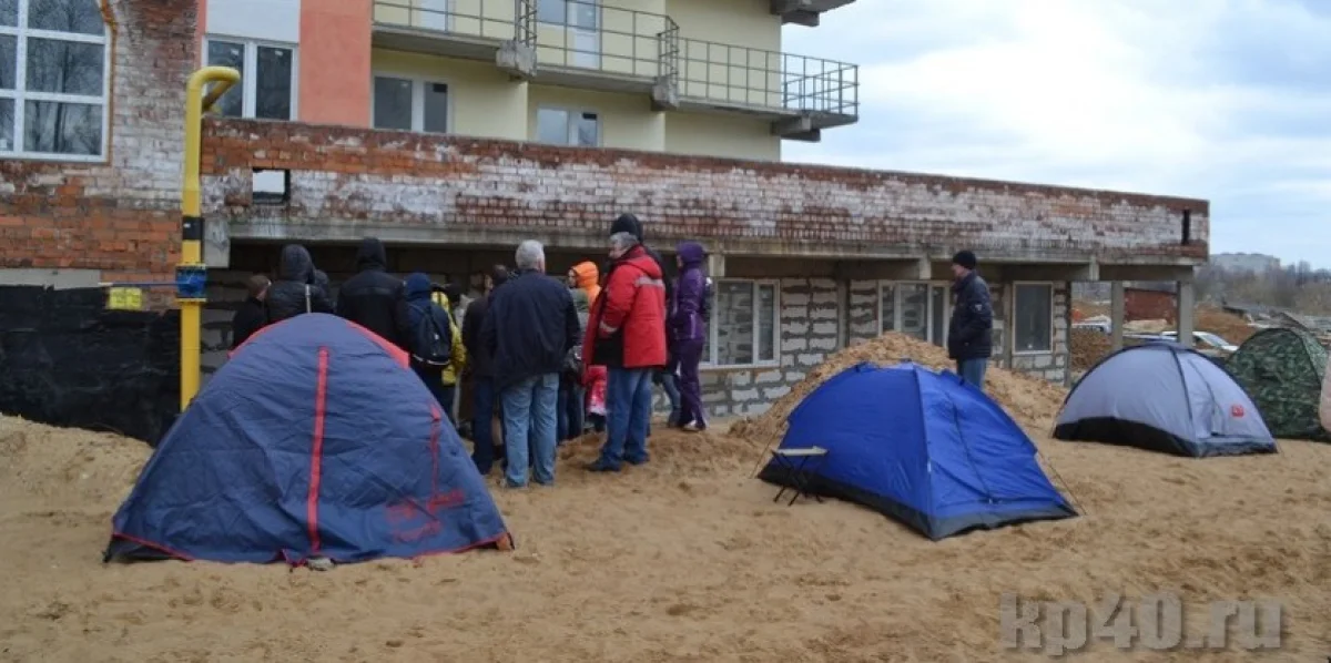 В субботу, 22 апреля, в 10 утра у недостроенной многоэтажки в микрорайоне «Солнечный» на улице Маяковского в Калуге обманутые дольщики разбили палаточный лагерь. Возле него с обеспокоенными лицами ходили десятки людей. Они заявляли, что с сегодняшнего дня живут на стройплощадке. Кроме того, пятеро человек начали голодовку. Среди отказавшихся от еды оказалась и многодетная кормящая мама.