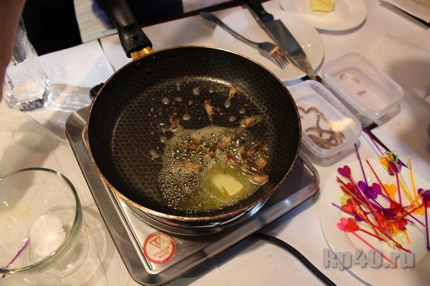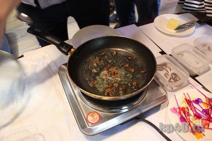 Все насекомые готовились на глазах участников: на электроплитку поставили сковородку, растопили в ней сливочное масло и добавили ещё живых тараканов. Насекомые жарились несколько минут.