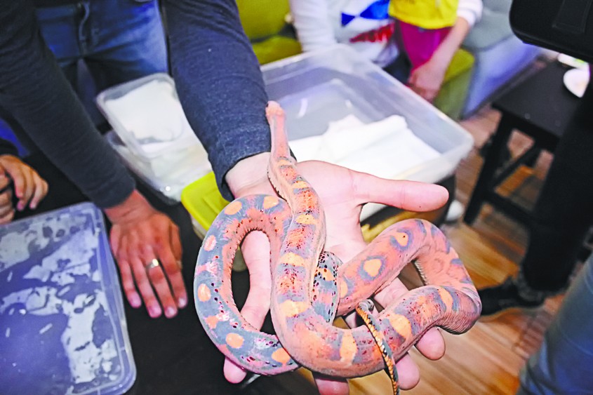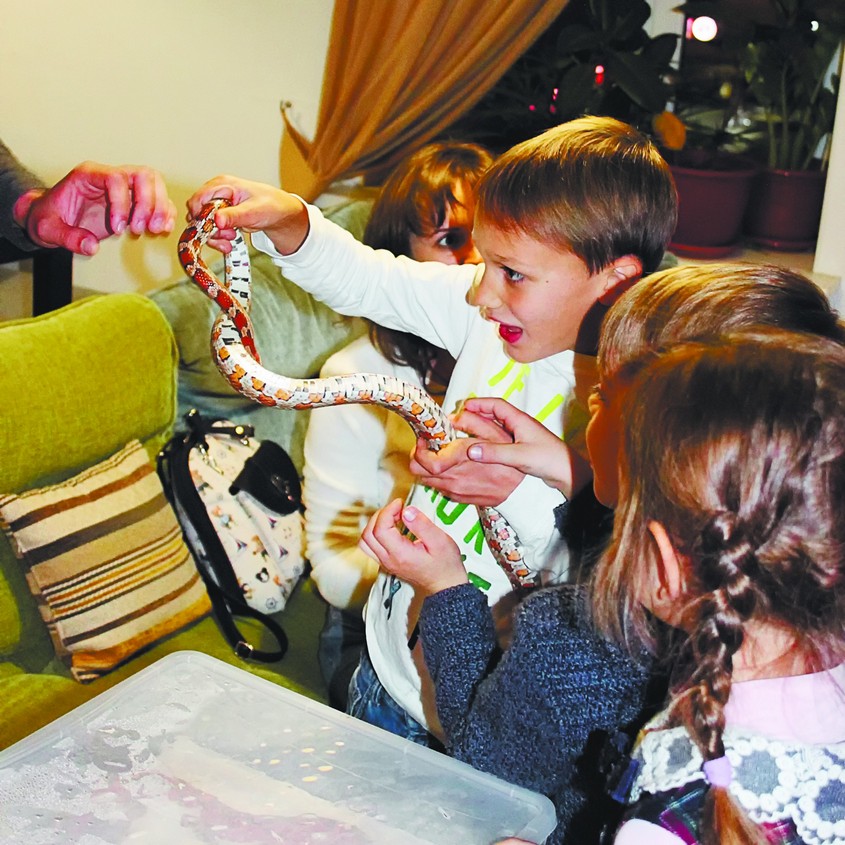 — Маисовый полоз. Абсолютно ручной. Кстати, обращаться со змеями надо очень осторожно. Им можно причинить травму, и они будут страдать. У нас жил большой тигровый питон. И как-то раз мы дали ему хомяка, которого он схватил и проглотил. Хомяк прогрыз питона и убежал. Питона мы зашили, спасли. Но то, что змеи тоже страдают, это правда.