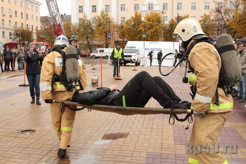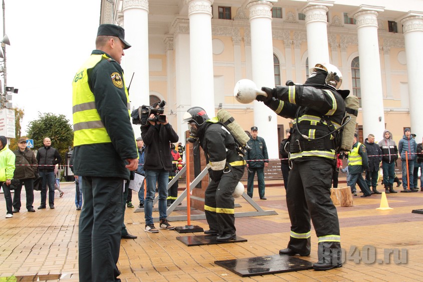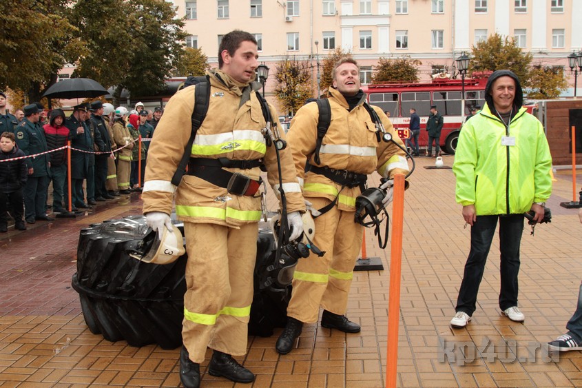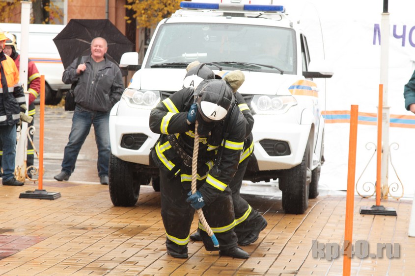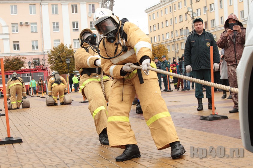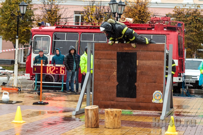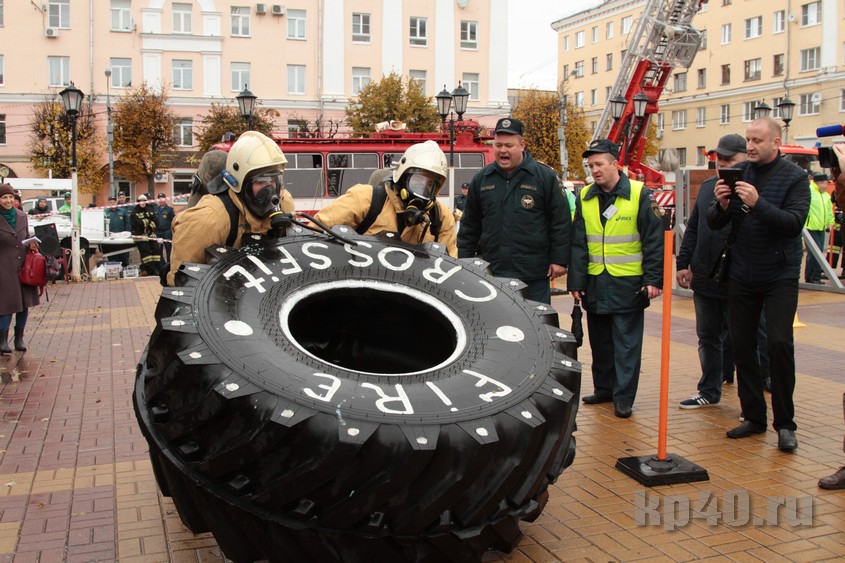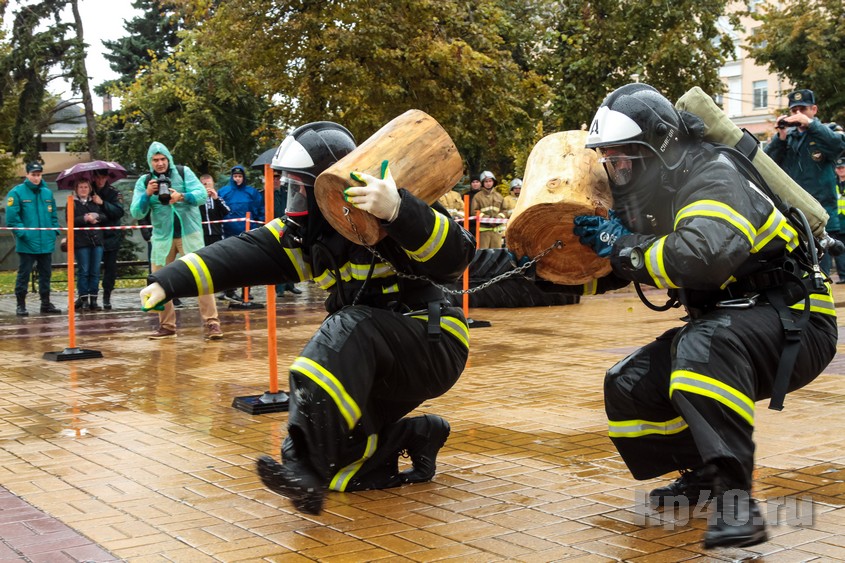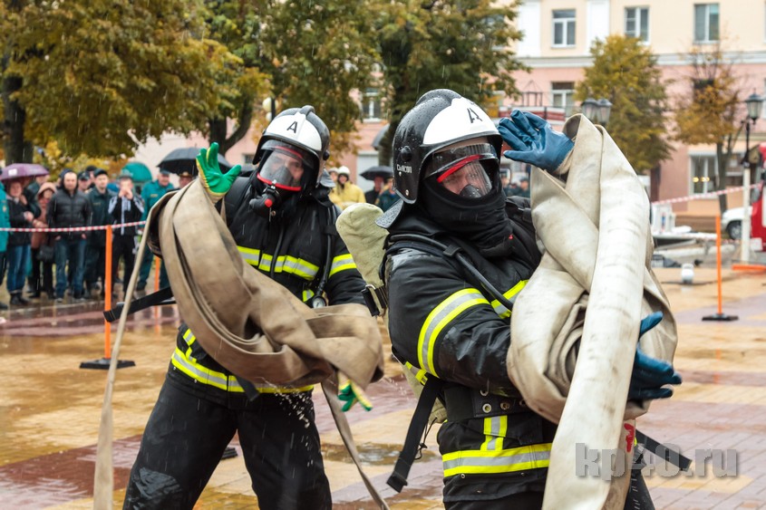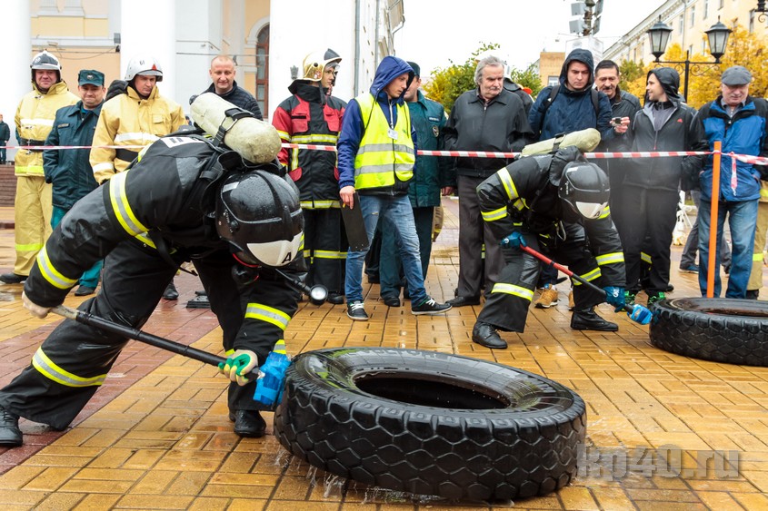 В пятницу, 13 октября, на Театральной площади в Калуге впервые прошли соревнования по пожарному многоборью. Их спасатели окрестили кроссфитом. Проливной дождь не помешал проведению зрелищных состязаний.